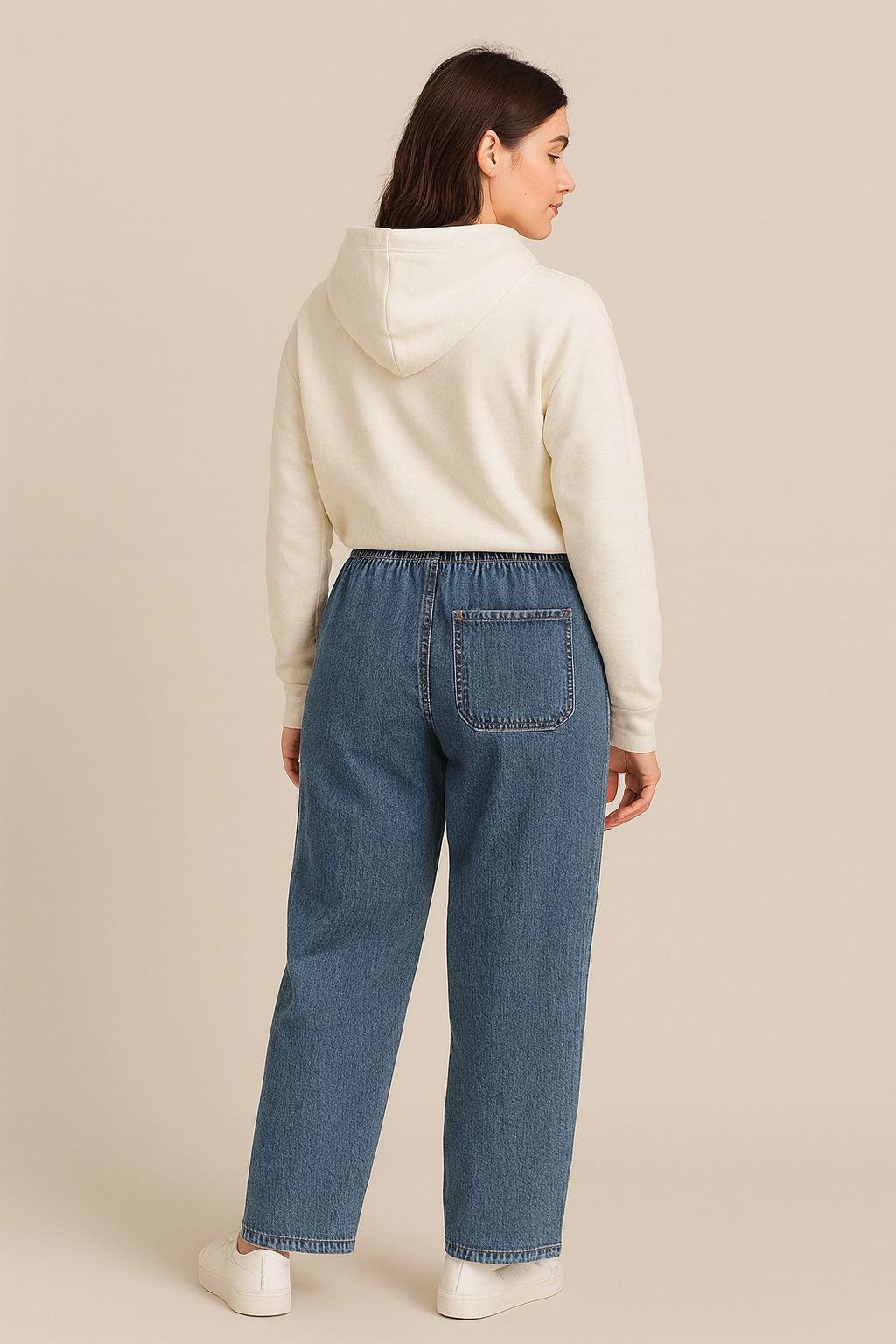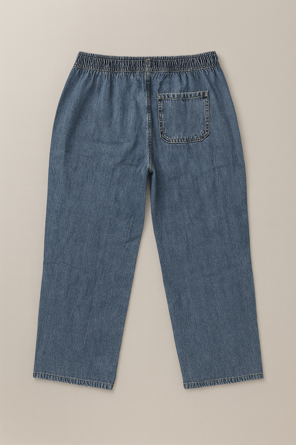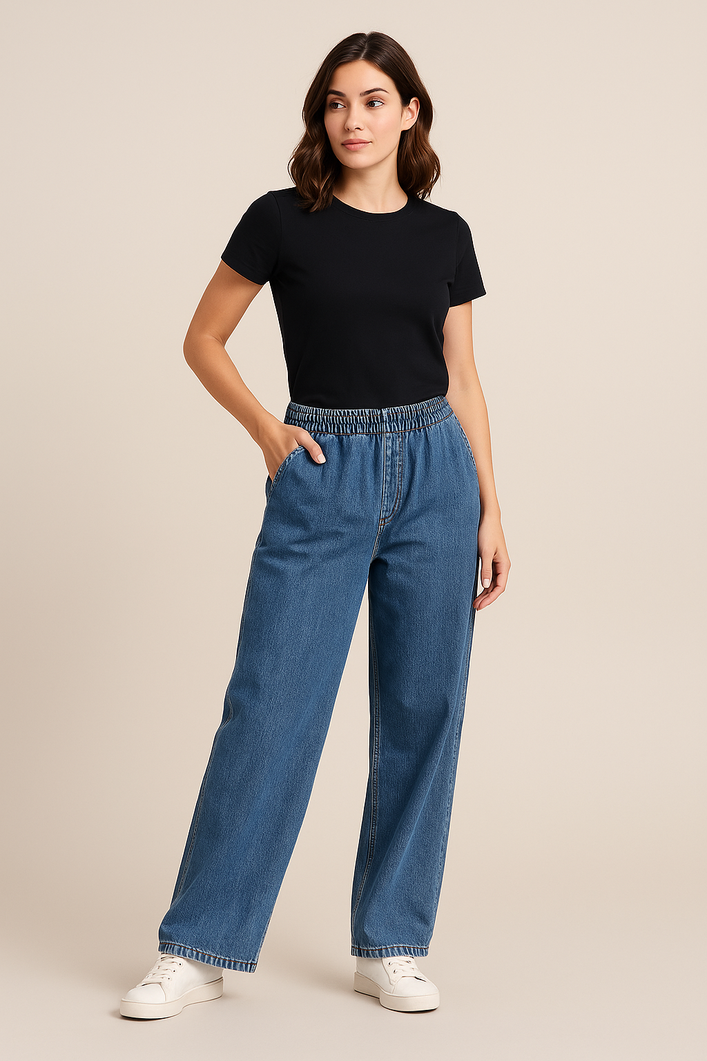 حافظي على إطلالة كاجوال مريحة مع هذا البنطال الجينز الواسع المزود بـ خصر مطاطي مع رباط قابل للتعديل. يجمع بين مظهر الجينز الكلاسيكي وراحة البنطال الرياضي، مما يجعله خيارًا مثاليًا للاستخدام اليومي.